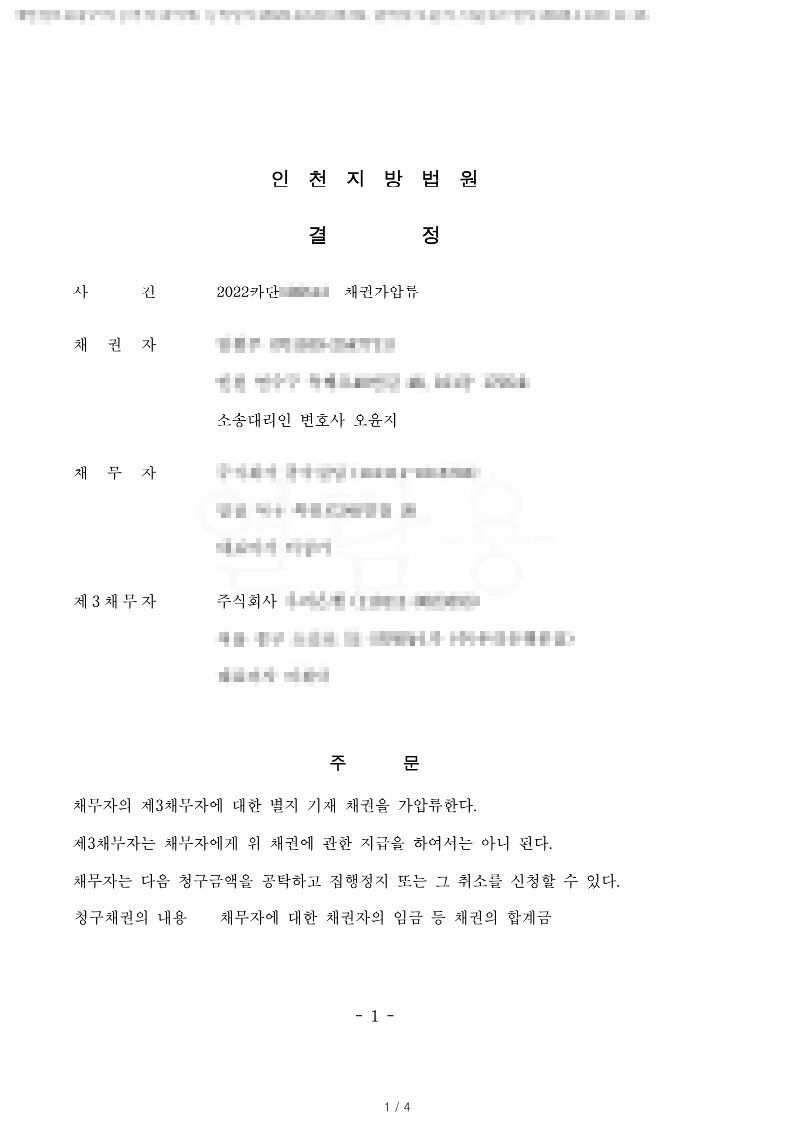 법원은 가압류 신청을 인용결정 해주었으며 본안의 종결 뒤 해당 은행의 계좌에 있던 돈을 압류하여 밀린 임금을 받을 수 있었습니다.