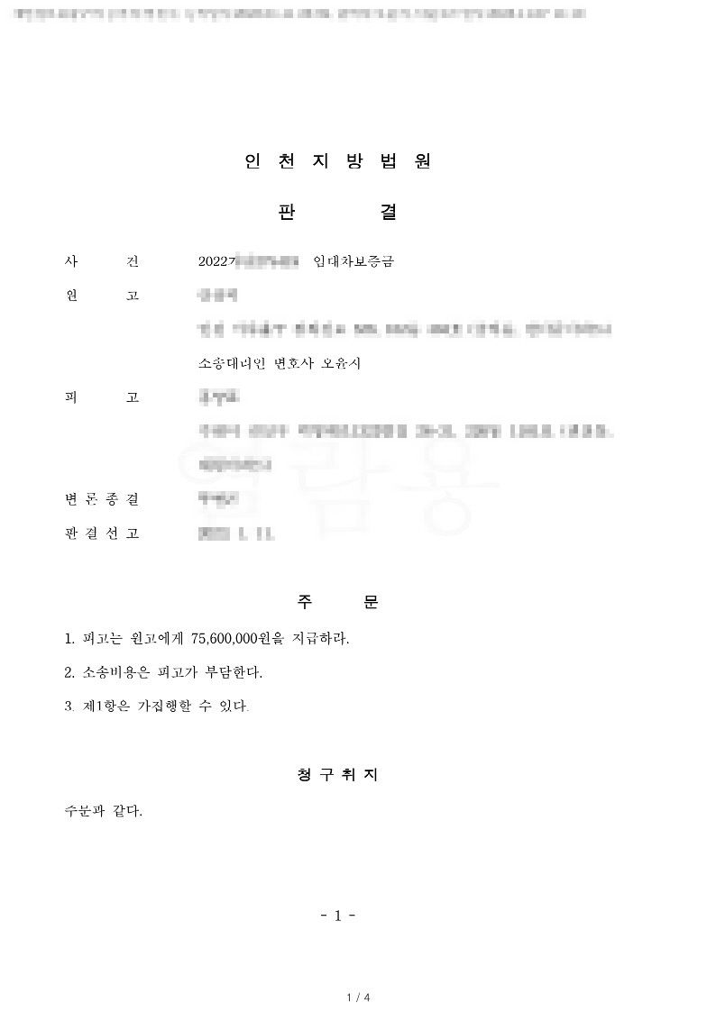 신속한 소제기와 빠른 기일지정요구 등을 통해 소제기후 판결 확정까지 짧은 기간내에 사건을 해결했습니다. 전부 승소판결을 받아 임대인의 재산에 강제집행도 바로 진행할 수 있었습니다.