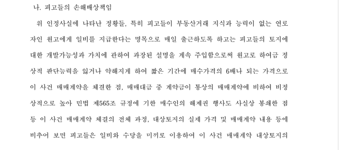 이 사안은 기획부동산 투자사기 사례입니다. 70대 노인에게 개발가능한 토지라고 속여서 자신이 구입한 가격보다 6배 이상의 가격으로 매도하였는데, 노인의 자녀분들이 찾아와서 진행하게 된 사건입니다.