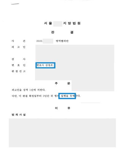 변호인의 노력 끝에 집행유예로 방어할 수 있었습니다.
