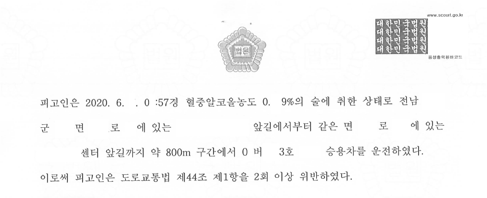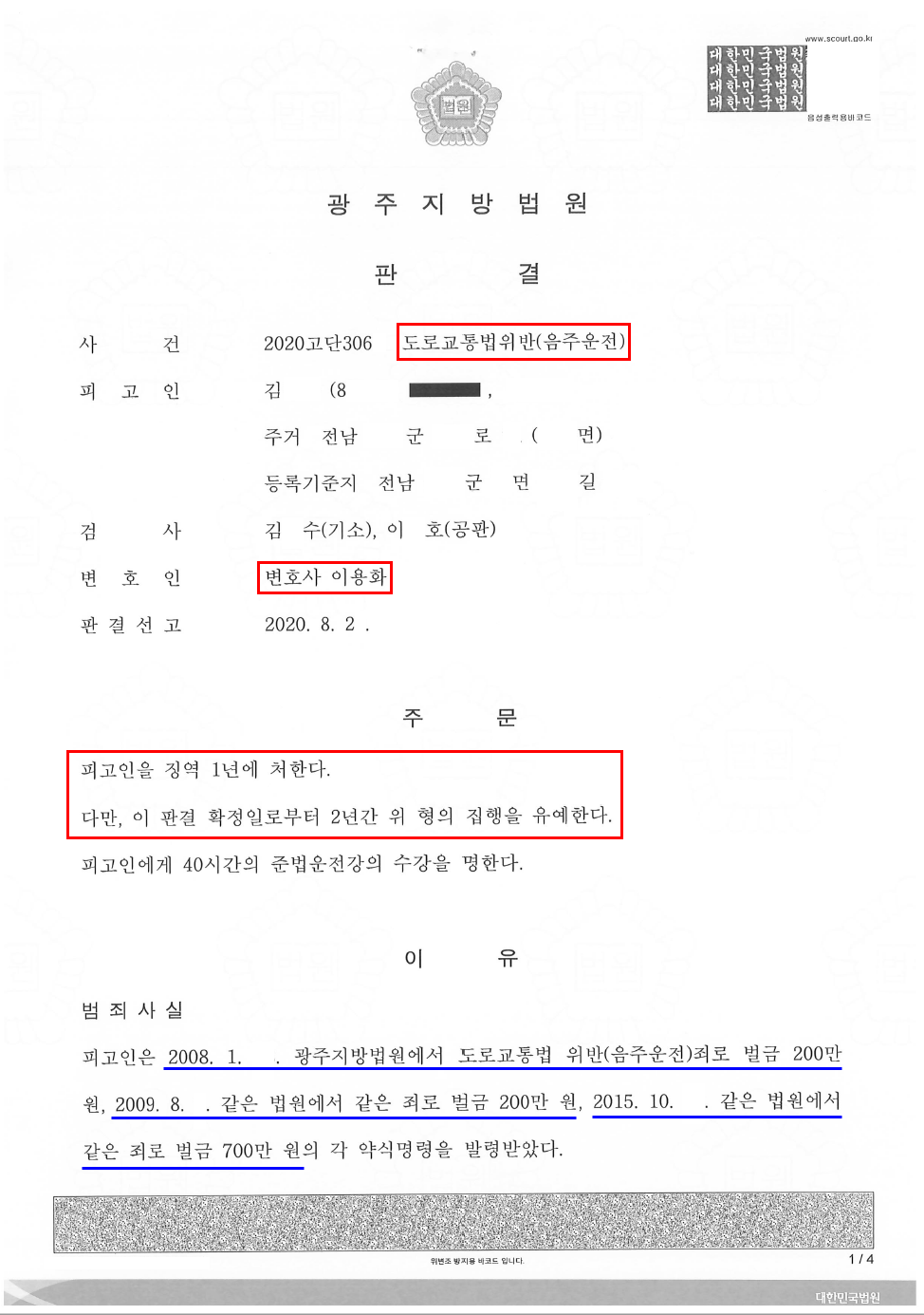 광주지방법원 2020고단3ㅁㅁ0 도로교통법위반(음주운전)