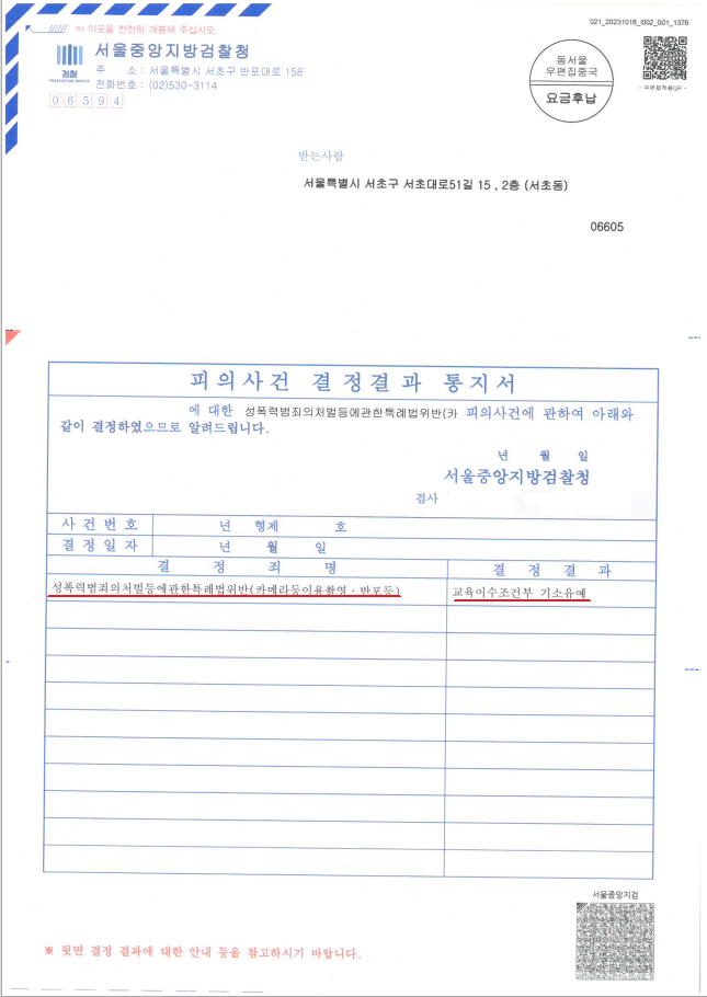 그러나 안내해드린 양형자료들과 선처를 호소하는 변호인의견서 및 경찰 조사 동행, 합의 진행을 통해 서울중앙지방검찰청은 의뢰인님에게 다시 한번 "기소유예처분"을 내렸습니다. 이로 인해 의뢰인님께서는 전과 기록이 남지도 않고, 신상정보 공개, 고지, 등록 대상도 되지 않았습니다.