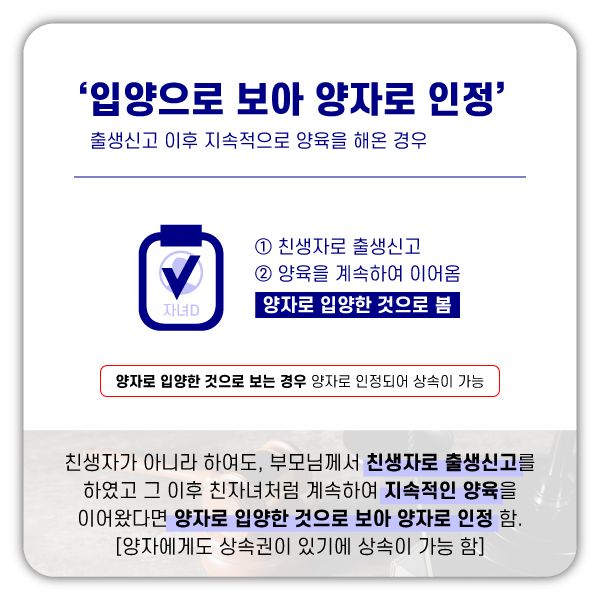 실제 친생자는 아니지만 부모님께서 귀하를 양자로 입양한 것으로 간주하고 양자로 인정받을 수 있습니다.