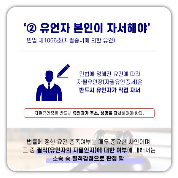 유언의 효력 판단은 엄격하게 법률에 정한 요건 충족 여부를 중심으로 이루어지게 되는 것이고, 유언자의 자서의 여부 등에 대해서는 소송 중 필적감정(은행, 수사기관, 일기장 등과 비교)등에 의하여 판정됩니다.