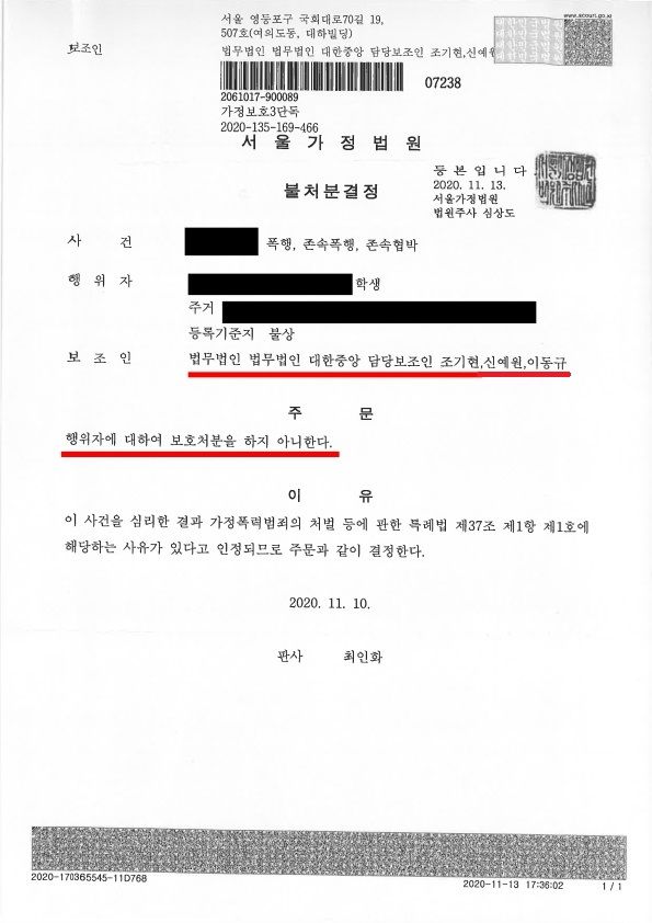 이동규 변호사의 주장이 받아들여져 형사사건에서 무죄와 유사한 '불처분' 결정을 받았습니다.