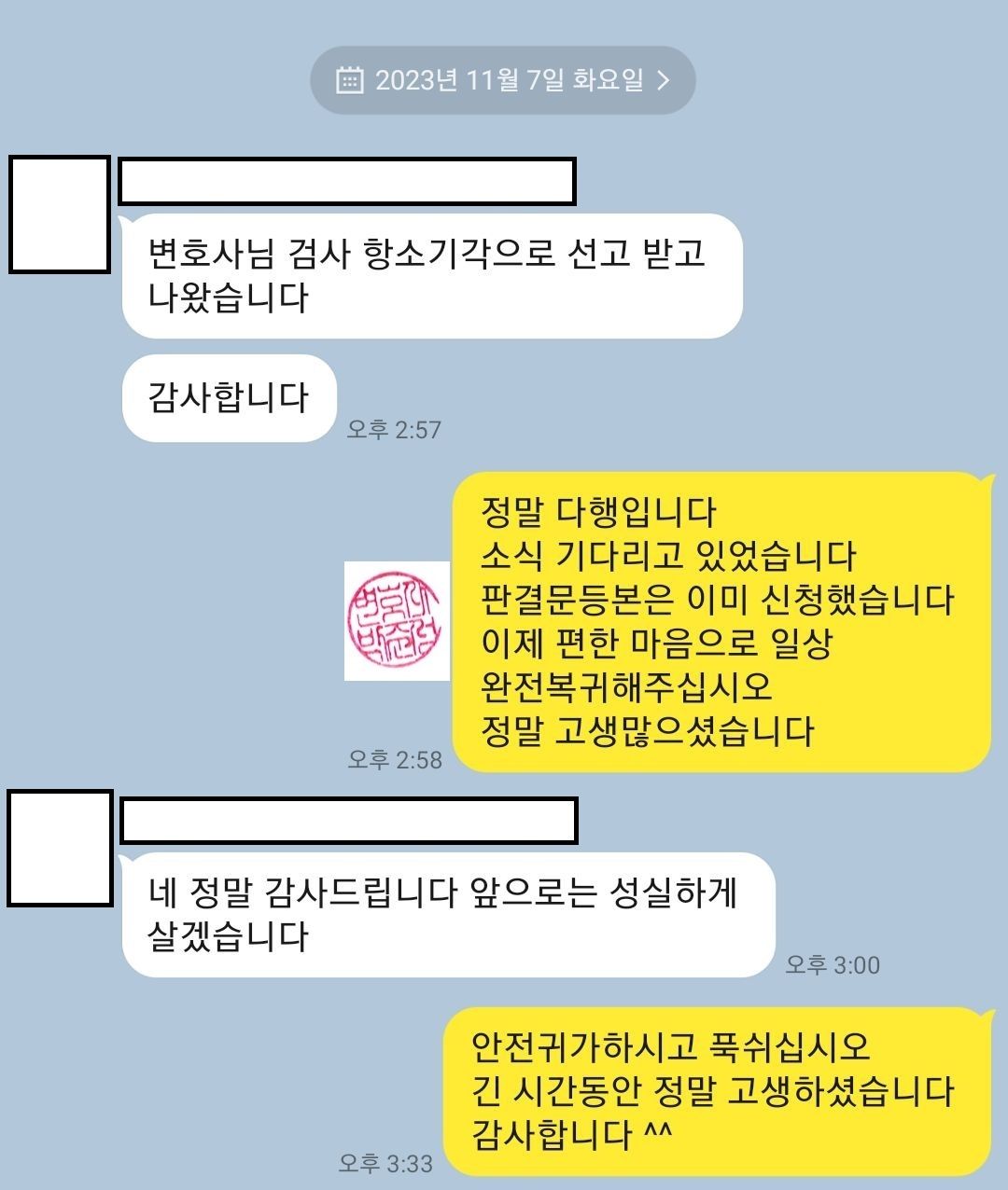 항소심 재판부는 이러한 점들을 모두 종합하여 검사 항소 기각이라는 선고를 하였고 의뢰인 님은 장장 3년 여에 걸친 마음고생 끝에 원래의 삶으로 편안하게 복귀할 수 있었습니다.