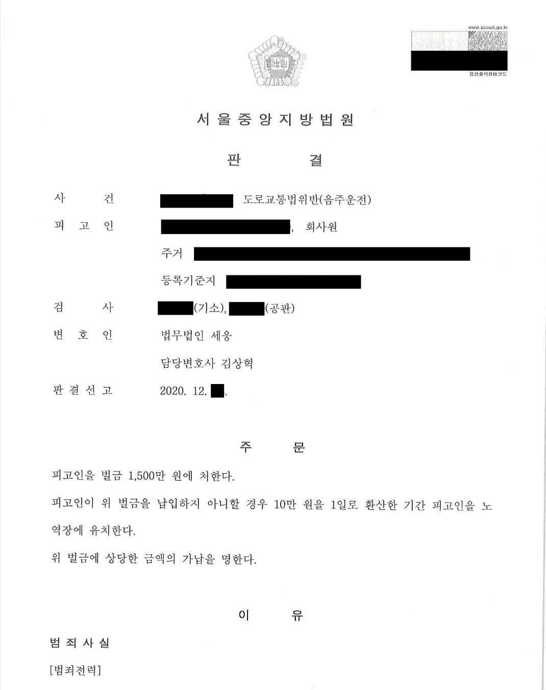 이러한 노력 덕분에, 법원에서는 의뢰인이 음주운전을 반복하고 음주운전 뿐 아니라 무면허운전 등 다른 교통범죄로도 처벌 받은 바 있으며, 혈중알코올농도 수치도 높으며 사고까지 발생하였다는 불리한 점을 지적하면서도 변호인이 주장·입증한 여러 양형 요소들을 두루 고려하여 벌금형의 선처를 하여주었습니다.