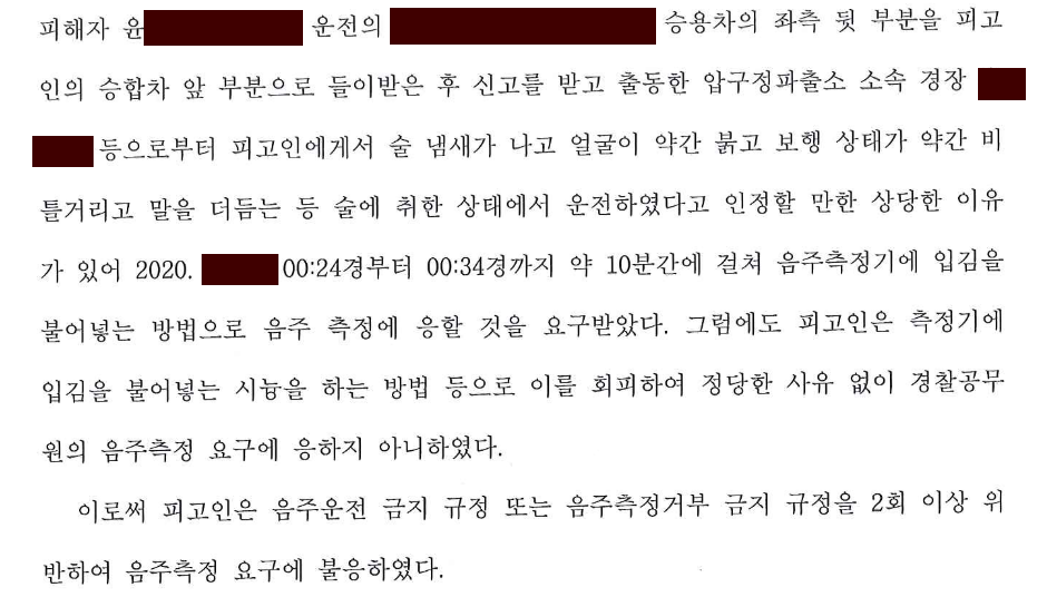 그런런데 의뢰인은 2020. 8.에 또 다시 음주운전을 하다가 신호대기 중인 차량의 후미를 추돌하는 사고를 발생시켰고, 출동한 경찰관에 의해 음주측정을 요구 받았으나 이미 수차례 음주운전으로 처벌받은 전력으로 인한 두려움 때문에 경찰관의 음주측정요구를 거부하는 잘못을 저지르고 말았습니다.