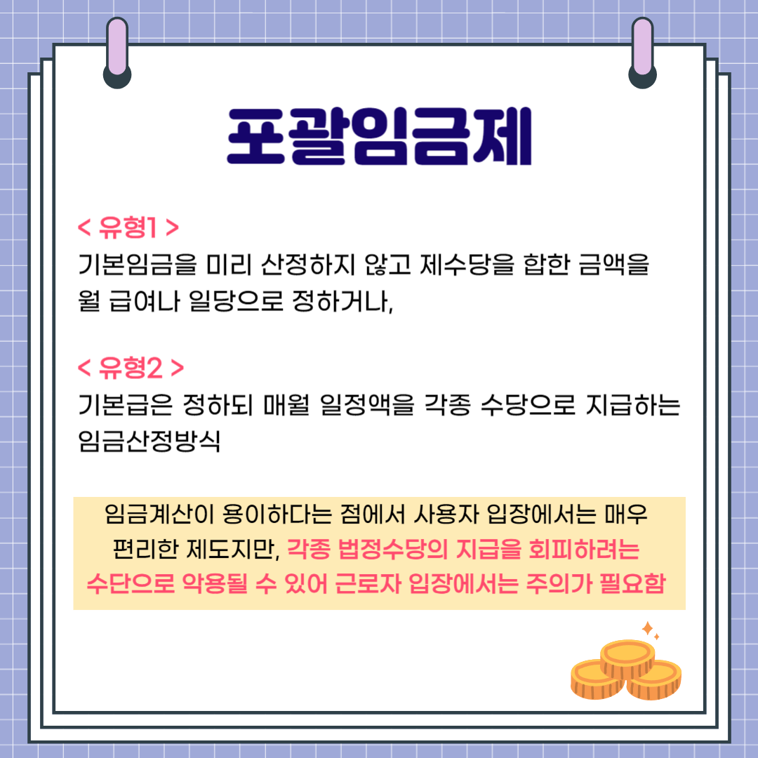 포괄임금제는 임금계산이 용이하다는 점에서 사용자 입장에서는 매우 편리한 제도지만, 각종 법정수당의 지급을 회피하려는 수단으로 악용될 수 있어 근로자 입장에서는 주의가 필요합니다.