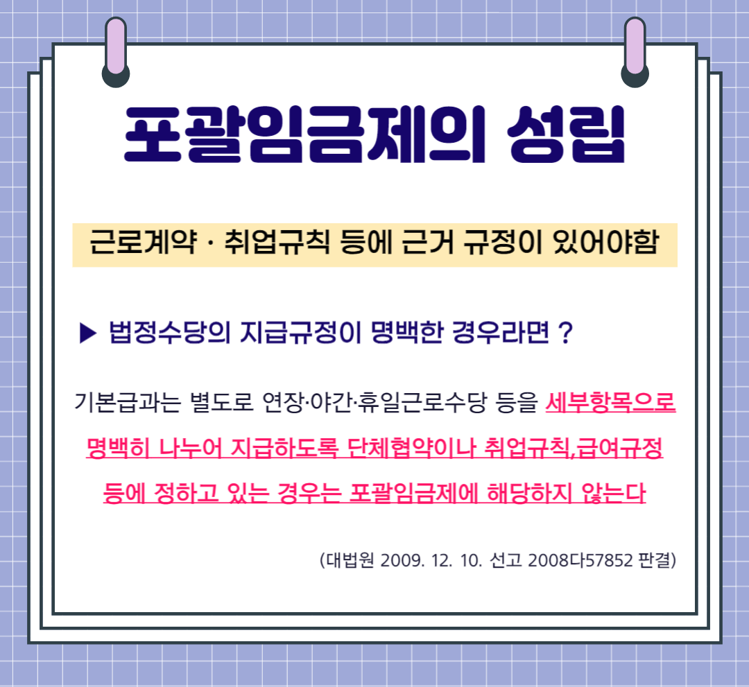 그러나, 기본급과는 별도로 연장·야간·휴일근로수당 등을 세부항목으로 명백히 나누어 지급하도록 단체협약이나 취업규칙,급여규정 등에 정하고 있는 경우는 포괄임금제에 해당하지 않습니다. (대법원 2009. 12. 10. 선고 2008다57852 판결)