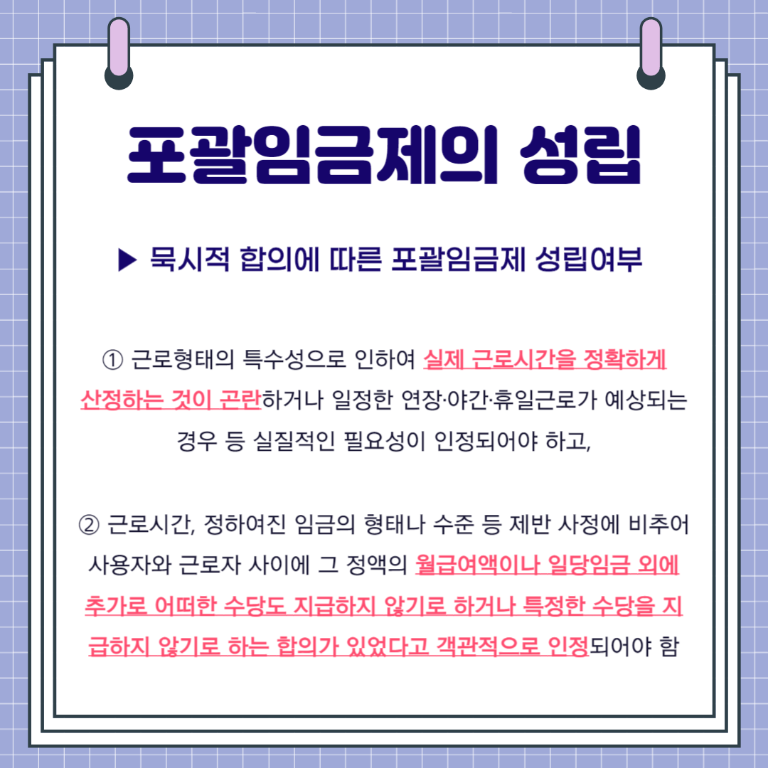 위에서 말씀드린대로 포괄임금제가 성립하기 위해서는 취업규칙 및 근로계약서에 ‘포괄임금’ 이라는 취지를 명시해야하는데요, 명시적으로 표기하지 않더라도 묵시적 합의에 의해서 포괄임금제가 성립하였다고 인정하기 위해서는