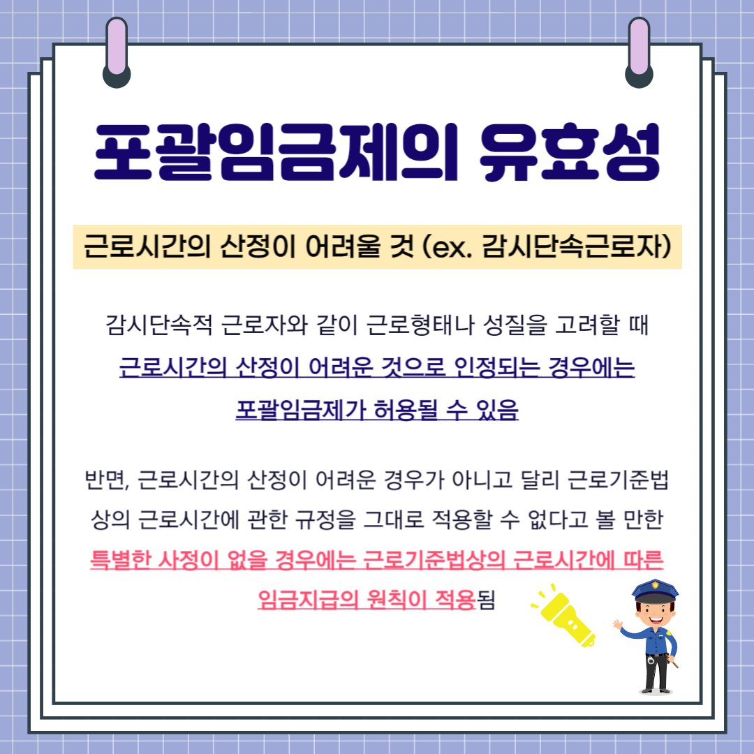 원칙적으로 임금지급 방법은 근로시간 수의 산정을 전제로 한 것인데요, 아파트 경비원, 물품감시원 같이 감시업무를 주 업무로 하는 근로자나, 근로가 간헐적ㆍ단속적으로 이루어져 휴게시간이나 대기시간이 많은 업무에 종사하는 이른바 감시단속적 근로자와 같이 근로형태나 성질을 고려할 때 근로시간의 산정이 어려운 것으로 인정되는 경우에는 근로시간 수에 상관없이 일정액을 법정수당으로 지급하는 포괄임금제가 허용될 수 있습니다.