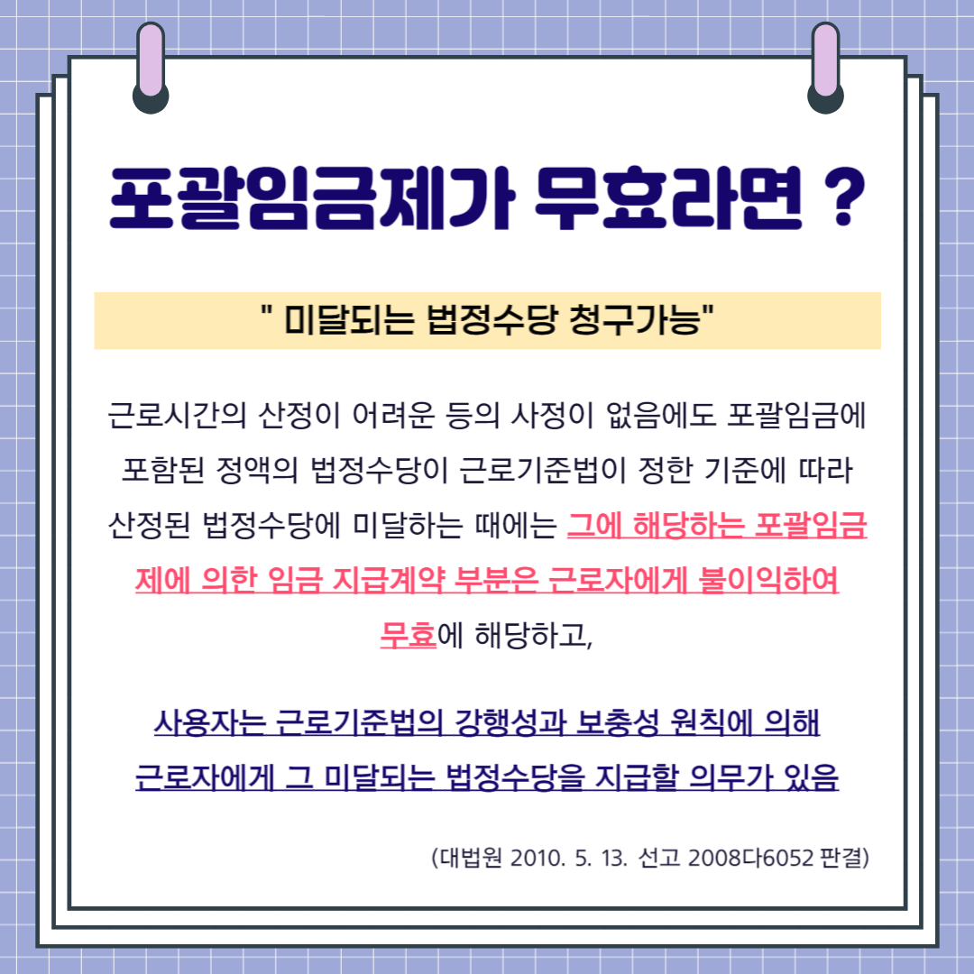 만약 근로시간의 산정이 어려운 등의 사정이 없음에도 포괄임금에 포함된 정액의 법정수당이 근로기준법이 정한 기준에 따라 산정된 법정수당에 미달하는 때에는 그에 해당하는 포괄임금제에 의한 임금 지급계약 부분은 근로자에게 불이익하여 무효에 해당하고, 사용자는 근로기준법의 강행성과 보충성 원칙에 의해 근로자에게 그 미달되는 법정수당을 지급할 의무가 있습니다. (대법원 2010. 5. 13. 선고 2008다6052 판결)