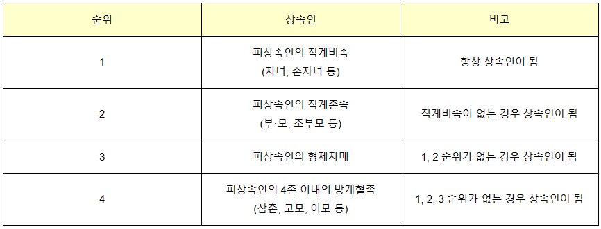 상속인은 다음과 같은 순위로 정해지고, 피상속인의 법률상 배우자는 피상속인의 직계비속 또는 피상속인의 직계존속인 상속인이 있는 경우에는 이들과 함께 공동상속인이 되며, 피상속인의 직계비속 또는 피상속인의 직계존속인 상속인이 없는 때에는 단독으로 상속인이 됩니다.