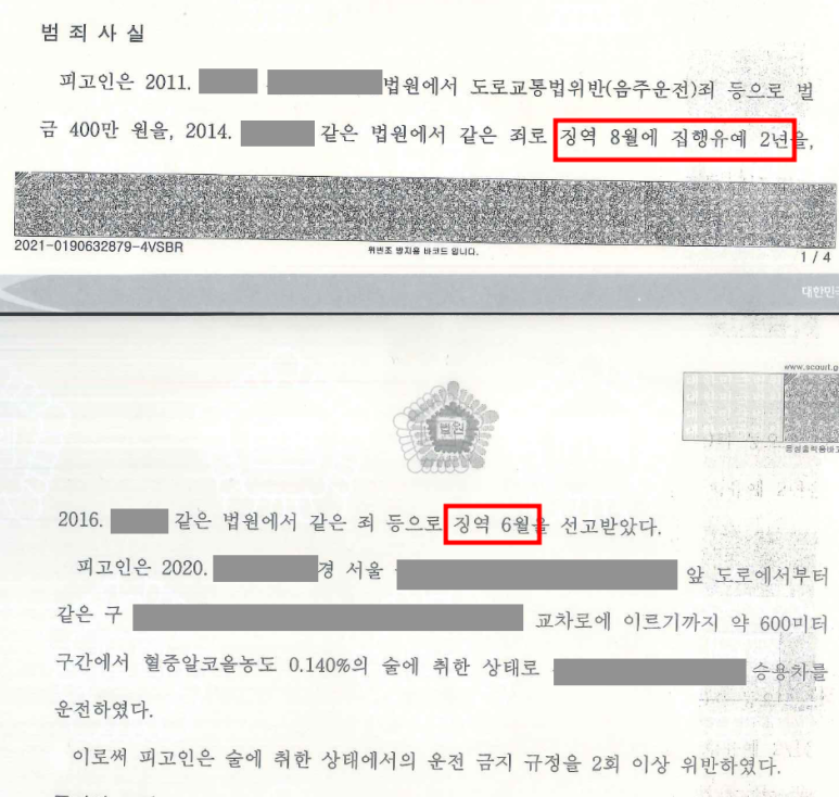 의뢰인은 음주운전으로 2011년 벌금형, 2014년 징역형의 집행유예를 선고 받았고 2016년에는 같은 죄로 징역 6월의 실형을 선고 받아 복역한 바 있었습니다.