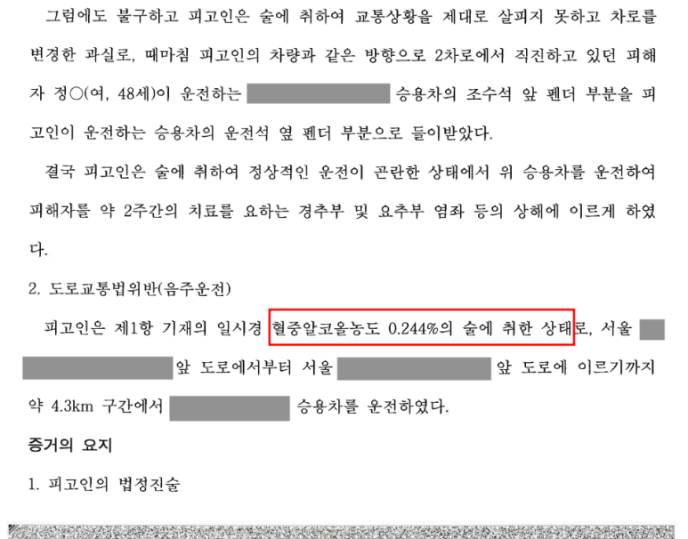 비록 음주운전으로 인한 것은 아니었지만 징역형의 집행유예 중에 범죄를 저지른 데다 사고가 나지 않았더라도 벌금형을 초과하는 처벌을 받을 수 있을 정도로 혈중알코올농도가 높았는데, 피해자에게 상해를 입히는 사고까지 발생시켰기 때문에 징역형의 실형이 선고될 가능성이 매우 높은 상황이었습니다.
