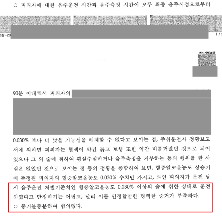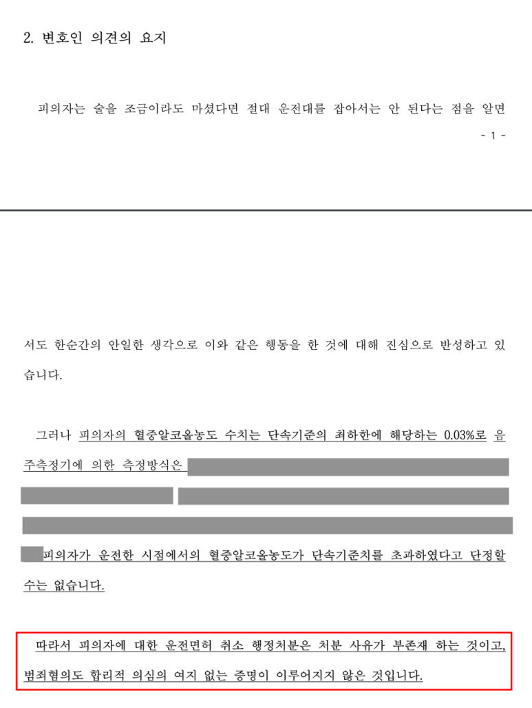 그러나 과거 1회 음주운전 전력으로 인하여 혈중알코올농도가 낮더라도 음주운전 혐의가 유죄로 인정된다면 음주 2진에 해당하여 면허가 취소되는 상황이었기 때문에 이를 막기 위해서 무혐의 처분이나 무죄 판결이 필요했습니다.