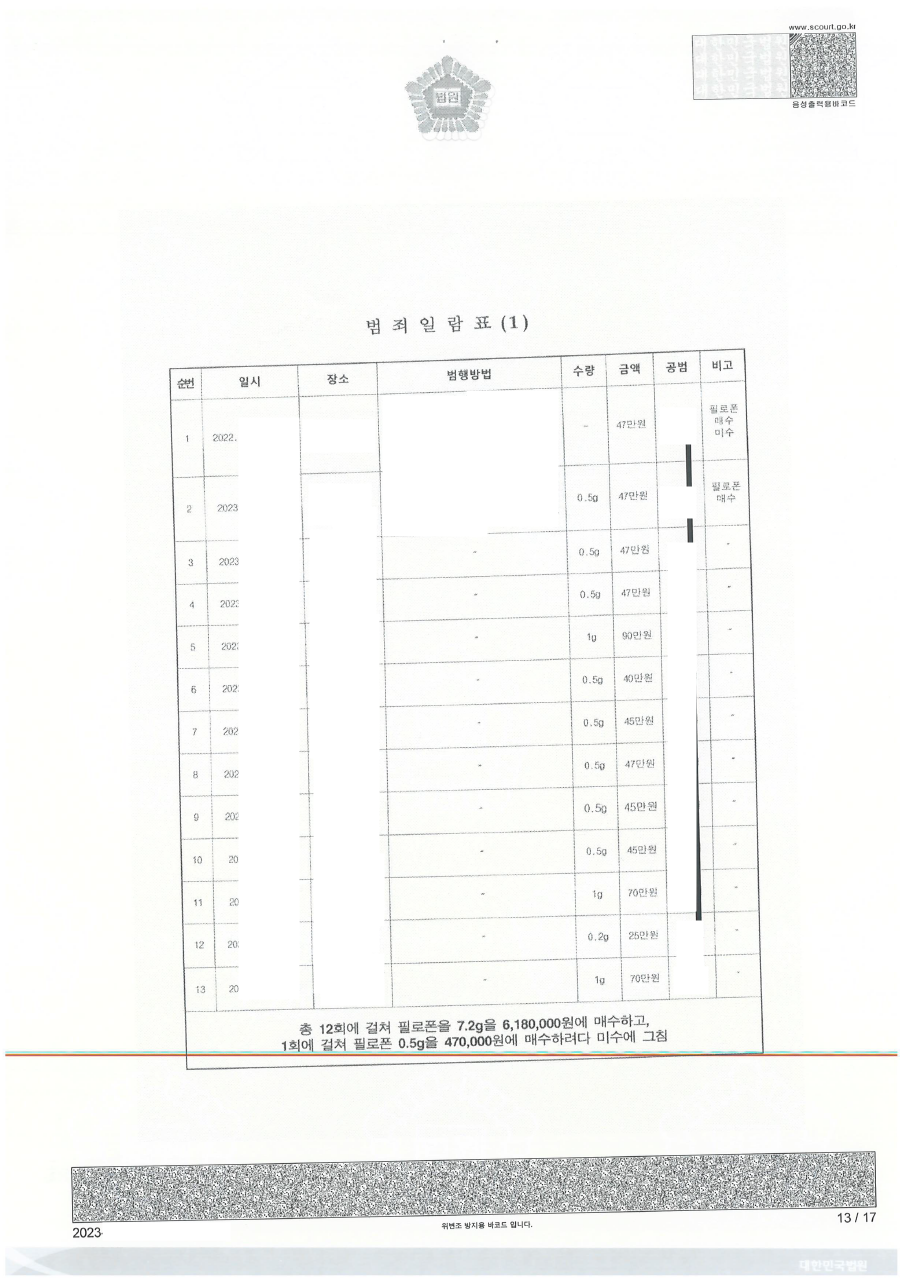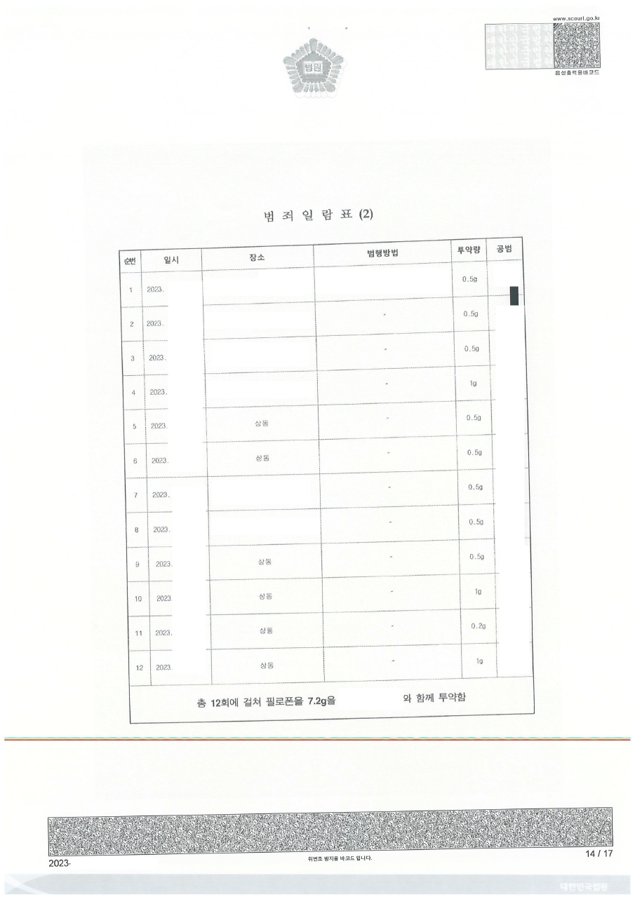 ** 그 외 추가 범죄일람표 범죄, 공소장 직접 기재 범죄사실까지 포함하면, 공소사실은 '필로폰(케타민, MDMA 포함) 매수 약 30회, 투약 약30회, 취급 약 30회' 등이었음