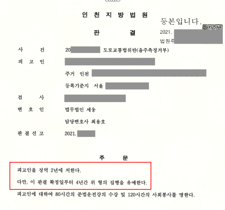 법원에서는 앞서 말한 의뢰인에게 인정되는 여러 불리한 정상을 이야기하면서도 변호인이 주장한 여러 유리한 정상을 고려하여 의뢰인에게 징역형의 집행유예(징역2년/집행유예4년)의 선처를 하여주었습니다.