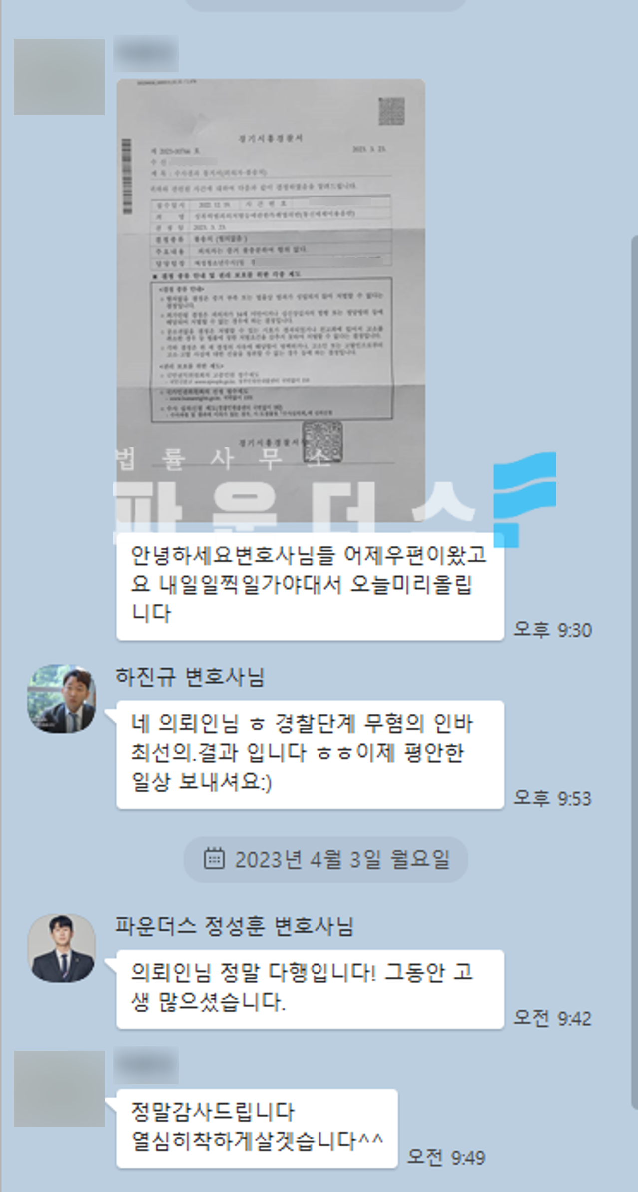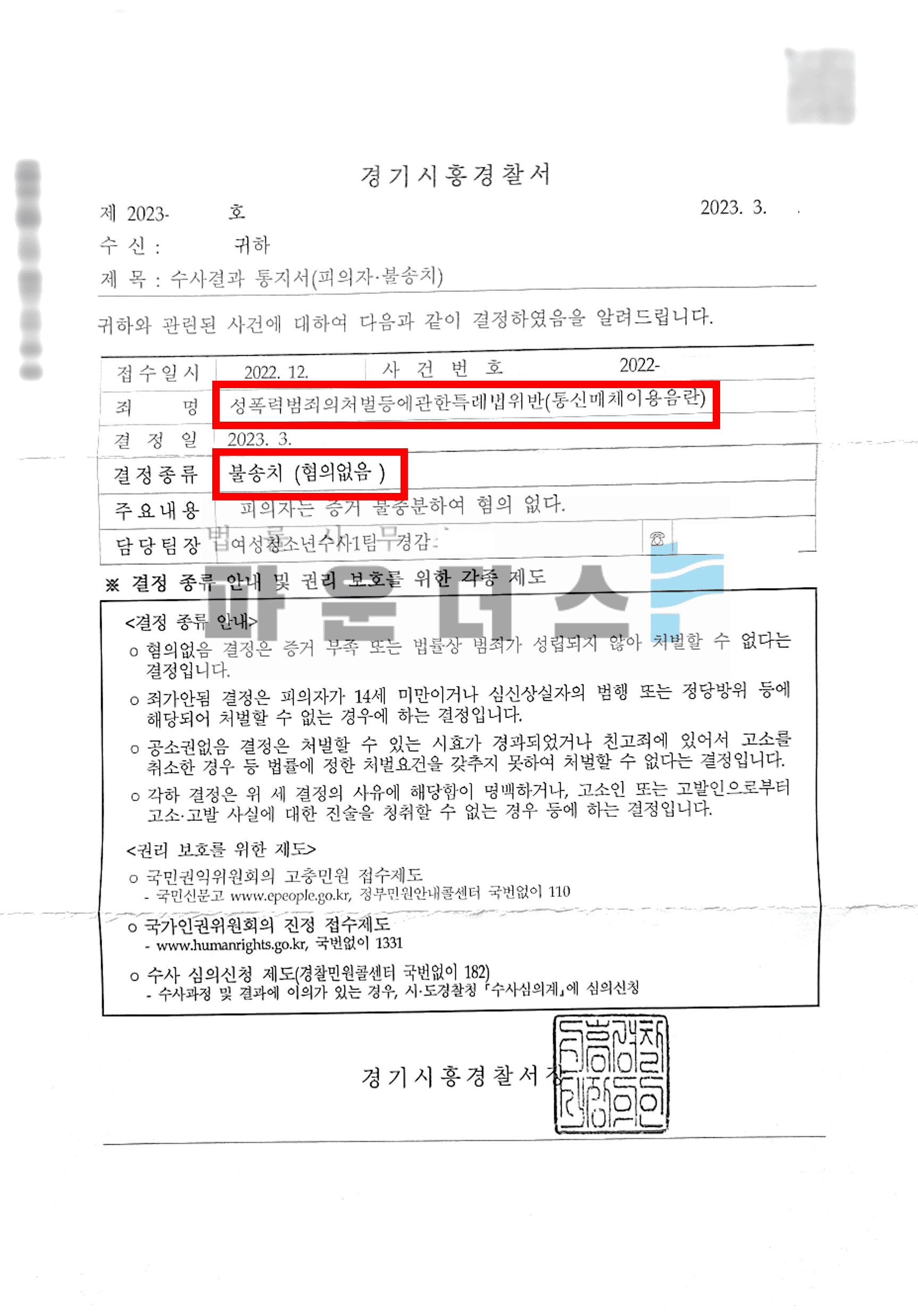 그 결과 의뢰인은 경찰 단계에서의 무혐의 즉 불송치 결정(혐의없음)으로 사건을 마무리 지을 수 있었습니다.