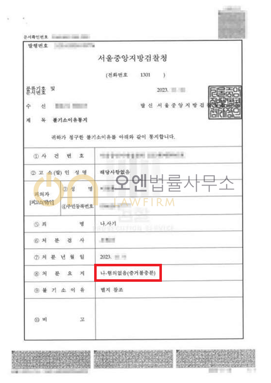 의뢰인의 사기 피의사실에 대하여 불기소처분(혐의없음)이 내려졌습니다.