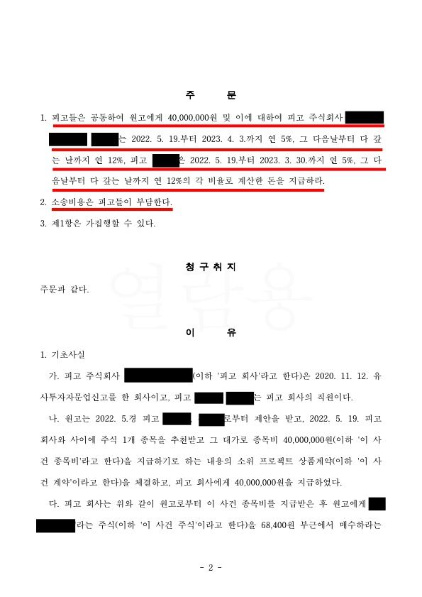 S업체는 40%의 수익률은 ‘예상’수익률이라고 안내했고, 계약서 및 카톡을 통해 수익을 보장하지 않는다고 명시했다며 ‘기망’이 아니라고 주장하였습니다.