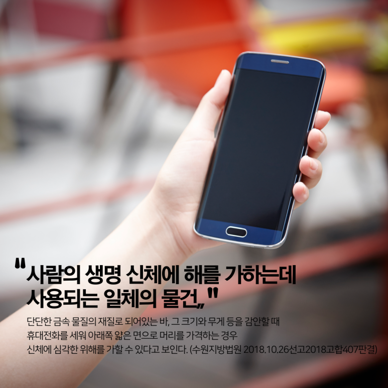 단단한 금속 물질의 재질로 되어있는바, 그 크기와 무게 등을 감안할 때 이 사건 휴대전화를 세워 아래쪽 얇은 면으로 머리를 가격하는 경우 신체에 심각한 위해를 가할 수 있다고 보인다. (수원지방법원 2018.10.26선고2018고합407판결)