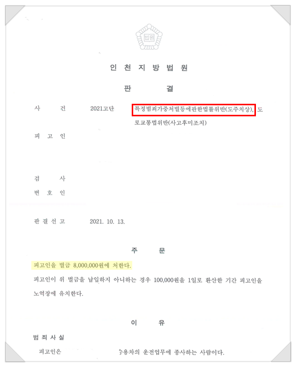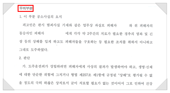 결과 : 도주치상 무죄, 사고후미조치 벌금형