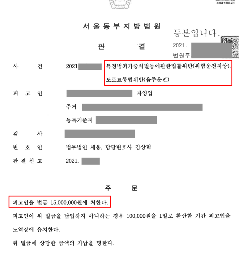 의뢰인의 과거 음주운전 전력은 약 14년 전의 것이기는 하나 윤창호법이라고 불리는 2회 이상의 음주운전 및 교통사고에 대한 가중처벌 규정이 적용되는 전력이었고, 혈중알코올농도도 높은 편이었기 때문에 징역형의 집행유예가 선고될 가능성이 높은 사건이었습니다.