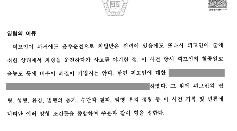 법원에서는 의뢰인이 과거 음주운전 처벌 전력이 있음에도 또다시 혈중알코올농도가 높은 상태에서 운전을 하다가 사고까지 야기한 점을 불리한 양형요소로 보면서도 여러 양형요소를 고려하여 의뢰인에게 벌금형의 선처를 하였습니다.