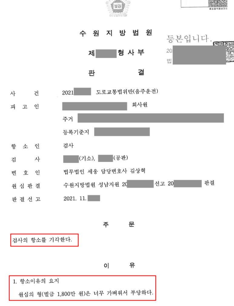 ※ 한편 검사는 의뢰인에게 벌금형을 선고한 원심의 형이 너무 가볍다는 이유로 항소를 하였으나, 변호인은 항소심에서도 검사의 주장을 효과적으로 방어하였고, 항소심 법원은 검사의 항소를 기각하는 판결을 하였습니다.