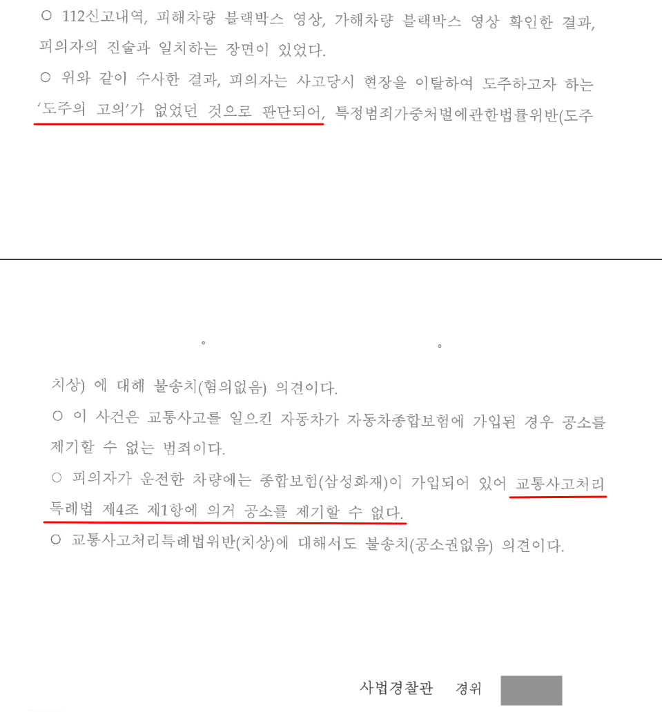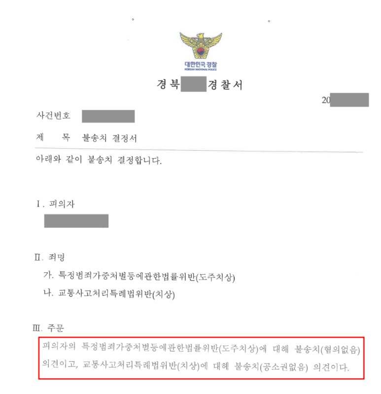 결국 경찰에서는 변호인의 주장대로 특정범죄가중처벌등에관한법률위반(도주치상)에 대해서는 혐의없음의 불송치 결정을, 교통사고처리특례법위반(치상)에 대해서는 공소권없음의 불송치결정을 하였습니다.
