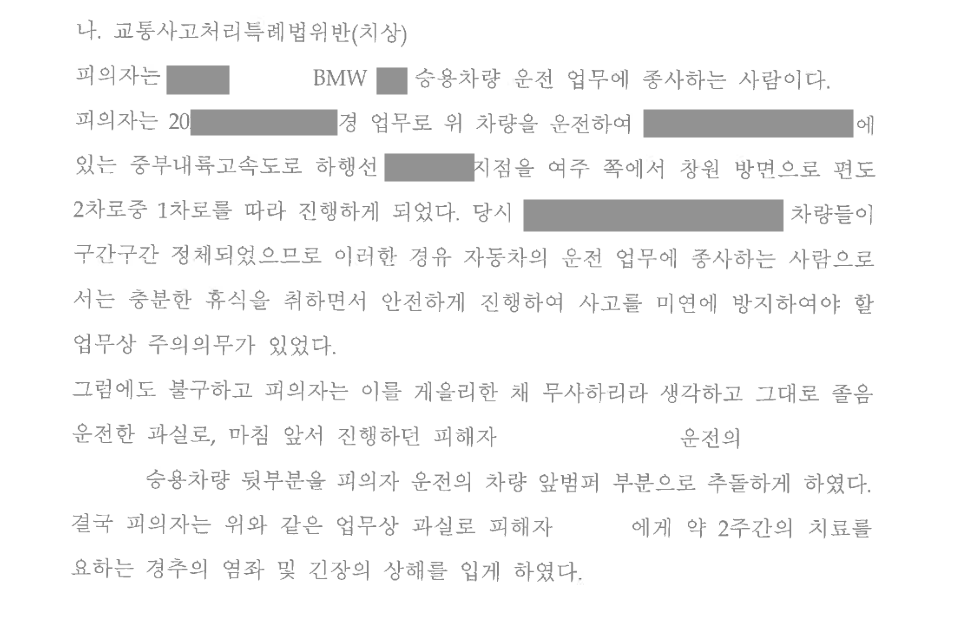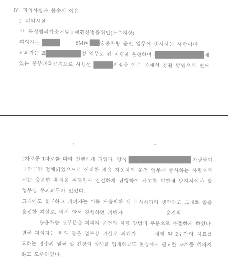 결국 의뢰인은 사고를 내고 즉시 정차하여 필요한 조치를 취하지 않고 도주하였다는 혐의로 특정범죄가중처벌등에관한법률위반(도주치상) 및 교통사고처리특례법위반(치상)으로 입건되어 경찰의 조사를 받게 되었습니다.
