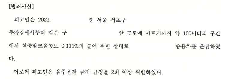의뢰인은 3회의 음주운전 전력으로 인하여 각 벌금형을 받았었는데 또 다시 혈중알코올농도 0.111%의 술에 취한 상태에서 운전을 하다가 적발되었고, 결국 과거와는 다르게 법정에 서서 재판을 받게 되었습니다.