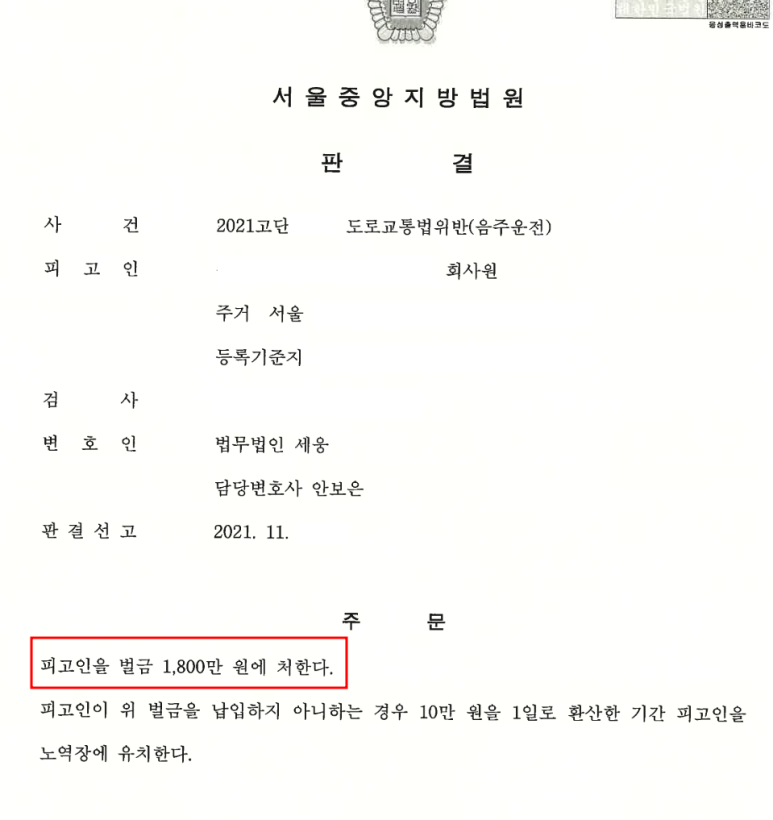 한편 의뢰인은 금융회사에 재직 중이었는데 직원들에게 높은 도덕적 기준을 요구하는 금융회사들은 대부분 금고 이상의 형의 선고를 받는 경우 징계해고 사유로 삼고 있었으므로 의뢰인은 4번째의 음주운전에 대해서도 어떻게든 벌금형을 받아야만 했습니다.