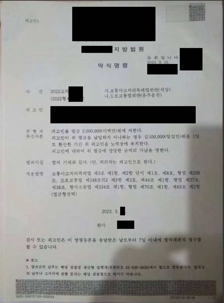 의뢰인이 음주상태에서 운전을 하고, 신호위반을 하여 인적피해를 유발한 점은 매우 불리한 사정이었습니다. 다만, 의뢰인이 전과가 없는 초범이고 피해자에게 선처를 호소하여 조기에 합의에 애ㅣ르게 되어 구약식처분으로 사건을 마무리 할 수 있었습니다. 정상적인 운전이 곤란하였다라고 판단될 경우 특가법상 위험운전치상으로 입건될 수도 있었던바 의뢰인의 사고 경위를 구체적으로 설명하여 의뢰인이 형사적인 불이익을 받지 않을 수 있도록 조력하였습니다.