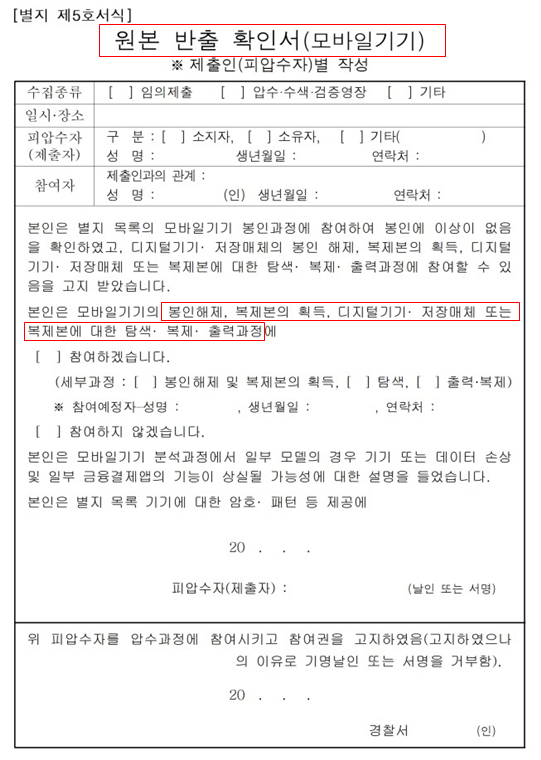 임의제출의 경우, 임의제출 하실 것인지 의사를 물어보고 협조를 구해 전자기기를