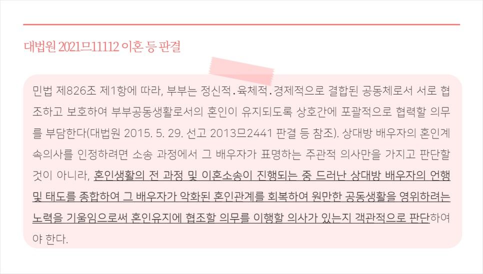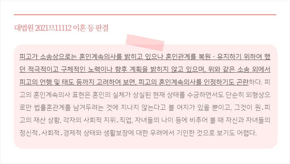 ✔ 피고가 소송상으로는 혼인계속 의사를 밝히고 있으나 혼인관계를 복원ㆍ유지하기 위하여 했던 적극적이고 구체적인 노력이나 향후 계획을 밝히지 않고 있다는 점