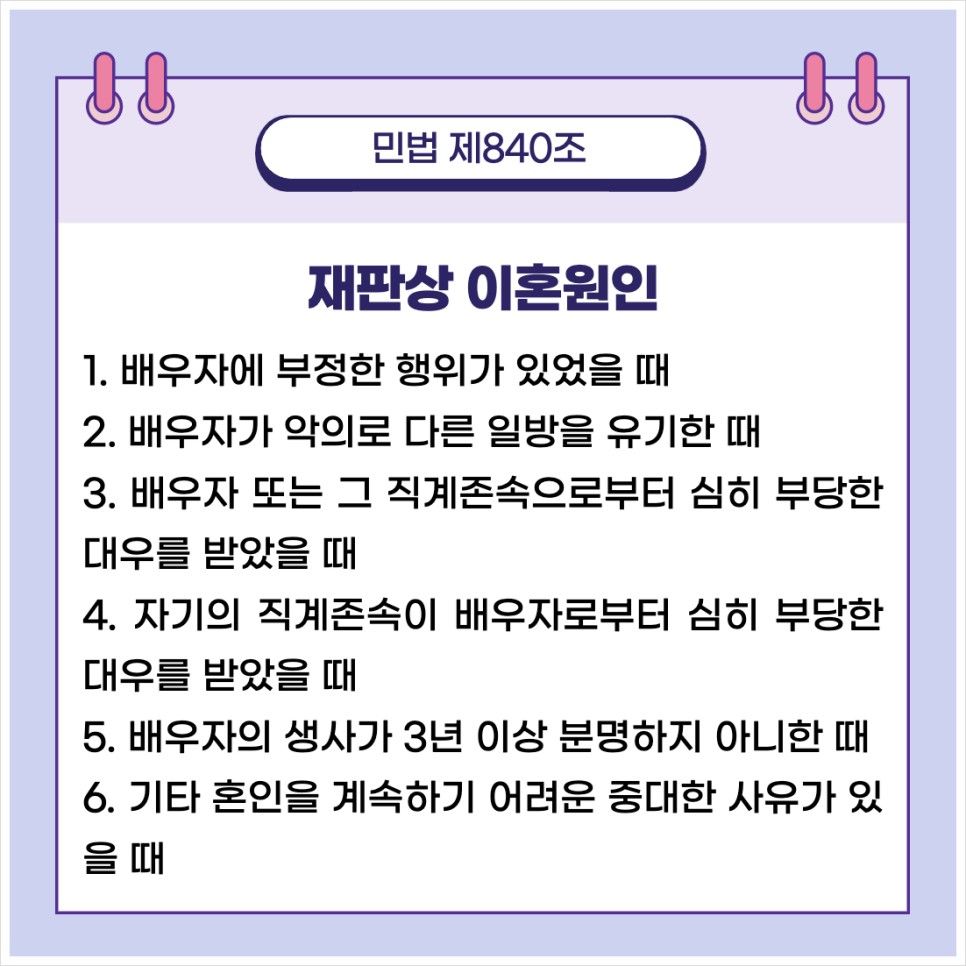 '별거'를 이유로 재판상 이혼을 청구하기 위해서는 '별거'가 민법 제840조 6호 '기타 혼인을 계속하기 어려운 중대한 사유'에 해당하는지를 판단해보아야 할 것입니다.