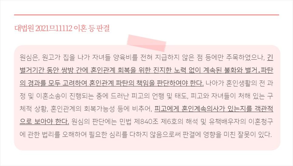 원심(2심)에서는 원고가 오랜 기간 자녀들의 양육비를 지급하지 않은 상황과 피고의 혼인계속의 의사를 인정하여 원고의 이혼 청구를 인정하지 않았습니다.