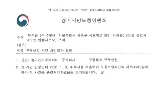 그럼에도 불구하고 본 사안은 본 대리인이 작성한 서면에 비추어 볼 때 근로자성이 부정될 것임이 강하게 예상되는 사건이었으므로 신청인측이 다툼을 포기하고 스스로 취하서를 제출한 사건입니다.