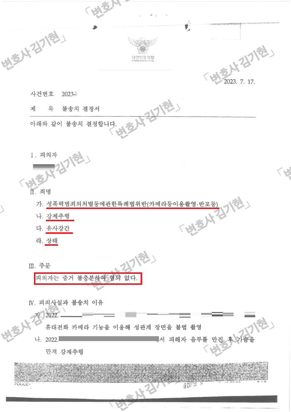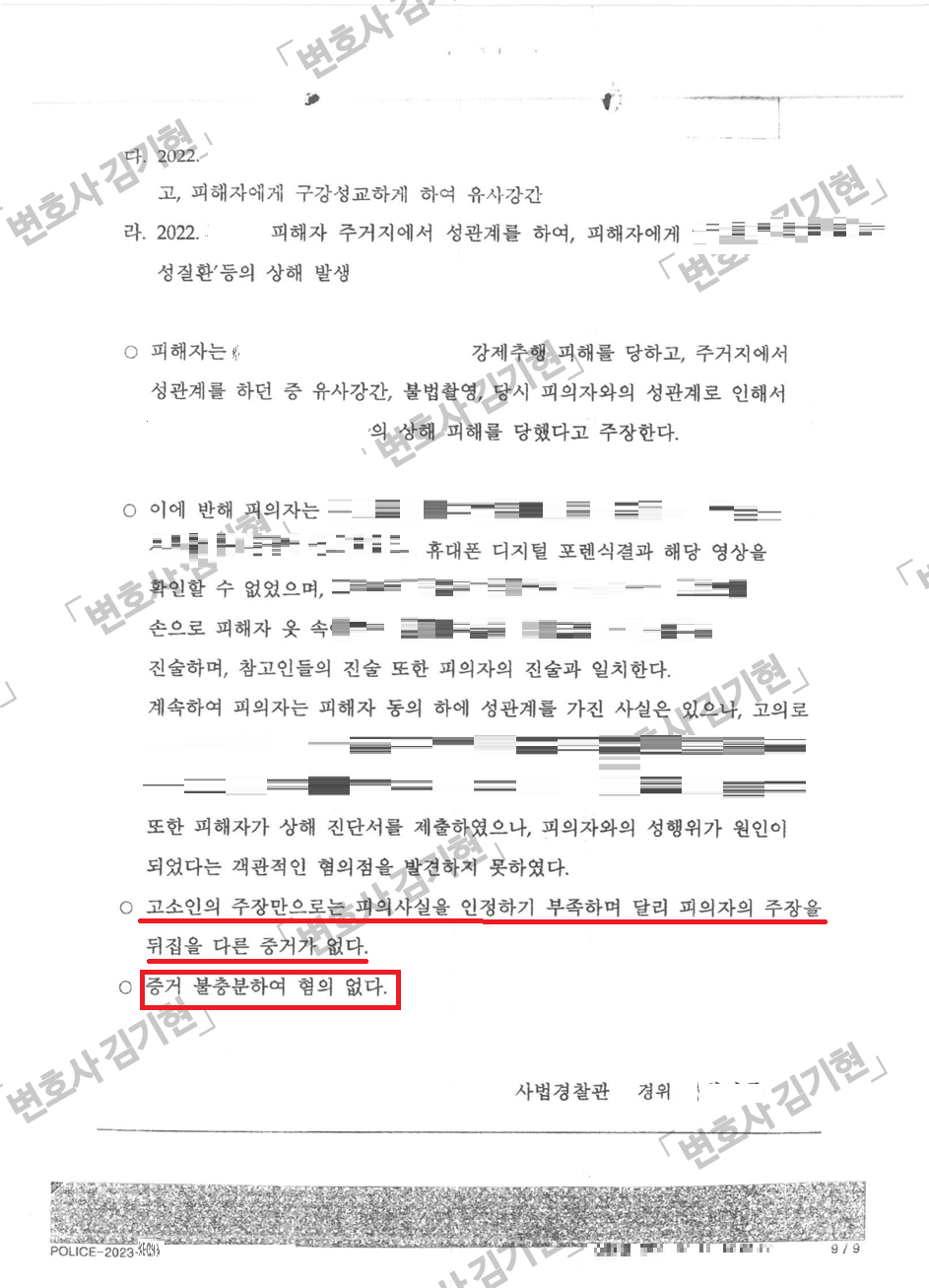 김기현 변호사는 경찰 조사 초기부터 사건을 맡아 피의자 조사를 철저하게 준비하고, 법률의견을 의견서로 개진하여 결국 모든 혐의에 대하여 '혐의 없음' 처분, 무죄를 받아냈습니다.