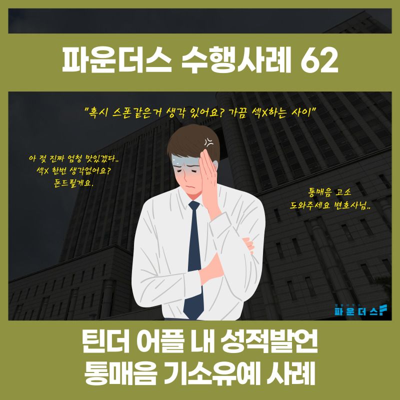 의뢰인은 틴더 어플 내에서 고소인과 대화를 하던 중 총 5회에 걸쳐 성적 발언을 한 것으로 통매음 혐의로 연루되어 파운더스 변호인의 조력을 요청하였습니다. 의뢰인이 고소인에 전송한 발언은 “혹시 스폰같은거 생각 있어요? 가끔 섹x하는 사이 젖 크고 x나 맛있겠다 키 크고 x지 크로 잘해요 돈드릴게요.” 등과 같은 성적 발언이었던 것으로 실형의 가능성이 높은 상황이었기 때문에 어떠한 상황에 의해 본 발언에 이르게 되었는지에 대하여 살펴볼 필요가 있었습니다.