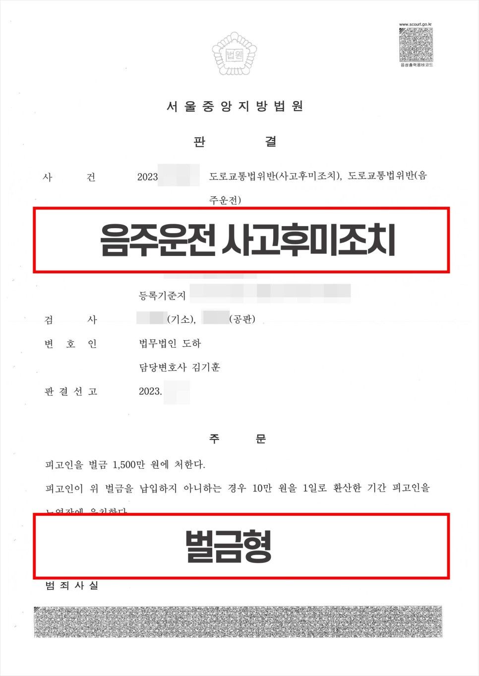 이로 인해 음주운전혐의뿐만 아니라 사고후 미조치 혐의까지 받게 되었습니다. 이에 의뢰인은 조금이나마 선처를 받기 위해 저희 법무법인을 찾아 조력을 요청하셨는데요.