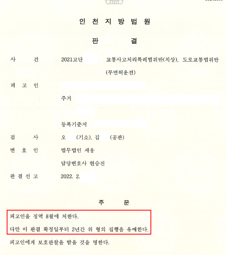 의뢰인은 법무법인 세웅을 방문하여 상담을 받았고, 변호인은 교통범죄 전력이 매우 많았다는 점, 무면허운전으로 이미 3차례 처벌 받은 전력이 있다는 점, 집행유예 기간 중이라는 점 등의 이유로 실형가능성이 다분하니 준비를 하는 것이 좋겠다는 조언을 하였습니다.