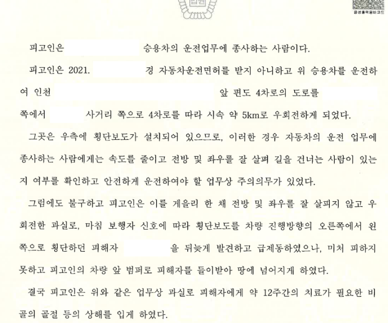 의뢰인은 2002년, 2009년 및 2016년 3차례의 무면허운전 전력을 포함하여 1990년대부터 9차례의 교통범죄 전력이 있었습니다. 그리고 2019년에는 업무상과실치상으로 징역형의 집행유예를 선고 받았습니다. 그런데 집행유예 기간 중이던 2021년 8월 면허가 취소된 상태에서 차를 몰다가 횡단보도를 건너던 피해자를 치어 전치 12주의 상해를 입히고 말았습니다.