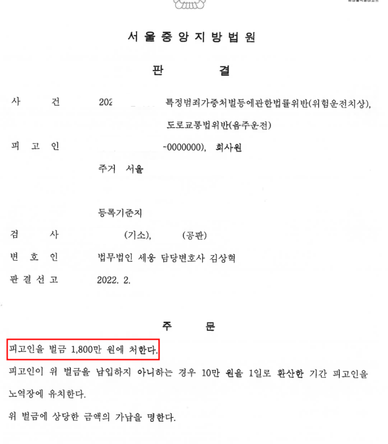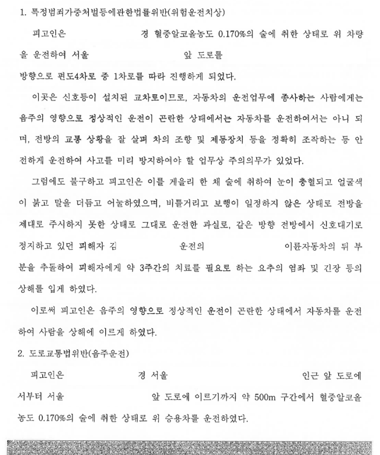 이로 인해 의뢰인은 도로교통법위반(음주운전) 및 특정범죄가중처벌등에관한법률위반(위험운전치상)으로 공소제기 되어 재판을 받게 되었습니다.