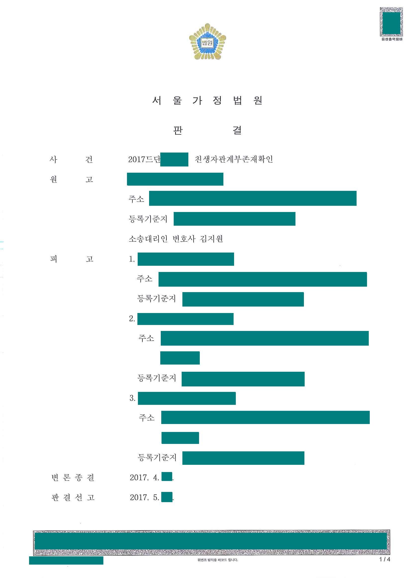 청구 인용되어 성공적으로 마무리된 사안입니다. 다만 원고가 피고1에 대한 출생신고를 하여야 하므로 가정법원의 출생사실확인까지 추가로 필요했습니다.