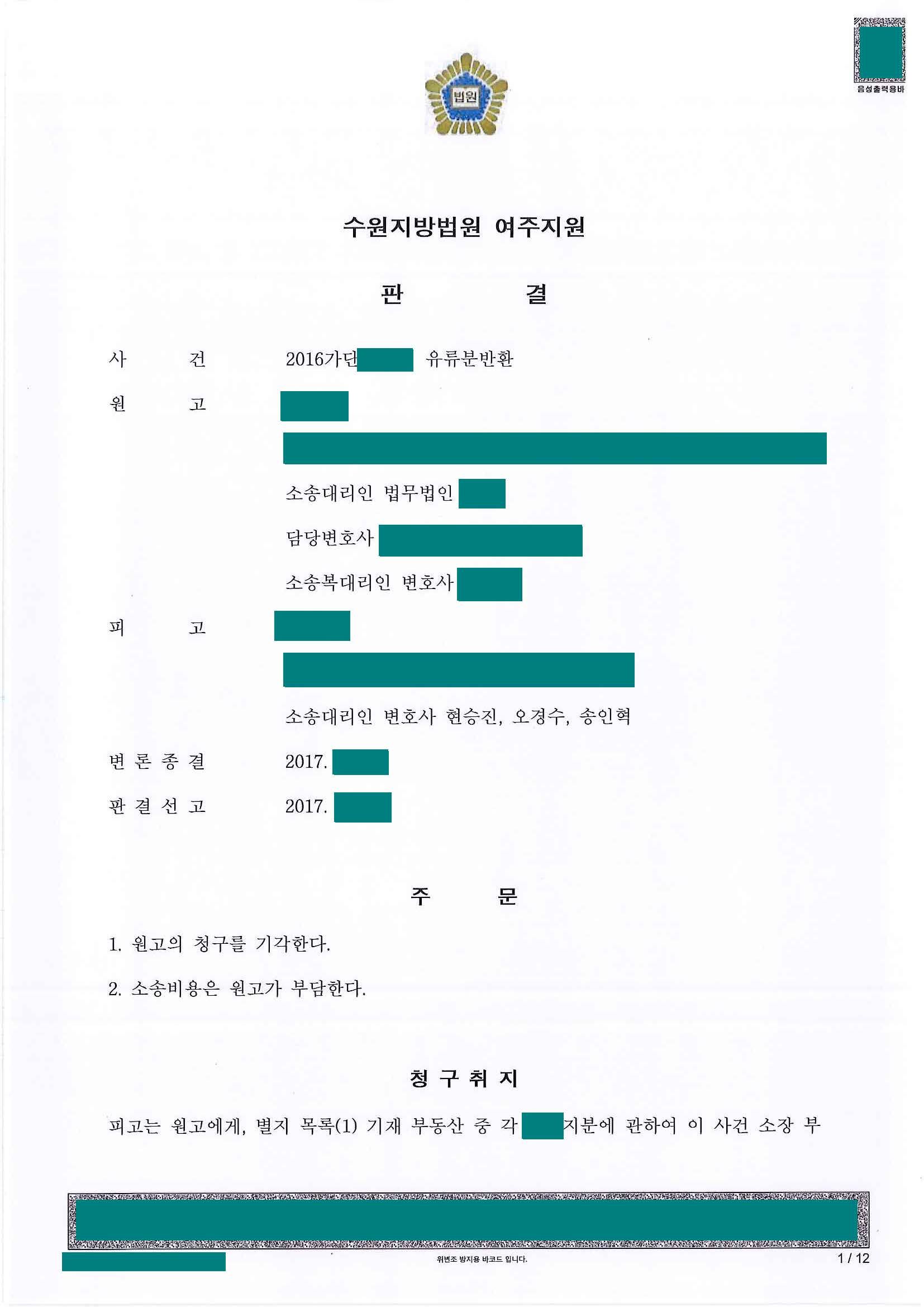 피고 전부 승소하여 성공적으로 마무리가 된 사안입니다.
