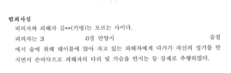 의뢰인은 친구들과 함께 술집에서 술을 마시던 중 술에 취해 테이블에 앉은 채 잠들어 있는 피해자를 발견하였습니다. 의뢰인과 피해자는 전혀 알지 못하는 사이었지만 의뢰인은 피해자의 일행이 자리를 비운 틈에 마치 일행인 것처럼 옆에 앉아서 피해자의 가슴과 다리를 만지는 추행을 하였고, 이를 수상하게 여긴 주변 목격자들의 신고로 경찰에 체포되어 강제추행 혐의로 입건되어 수사를 받게 되었습니다.